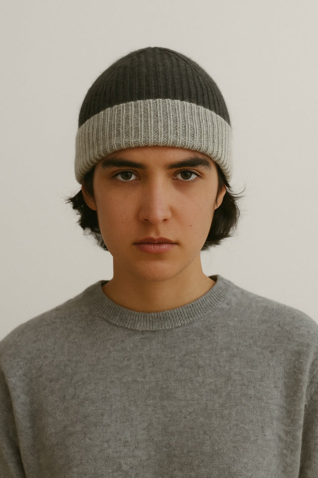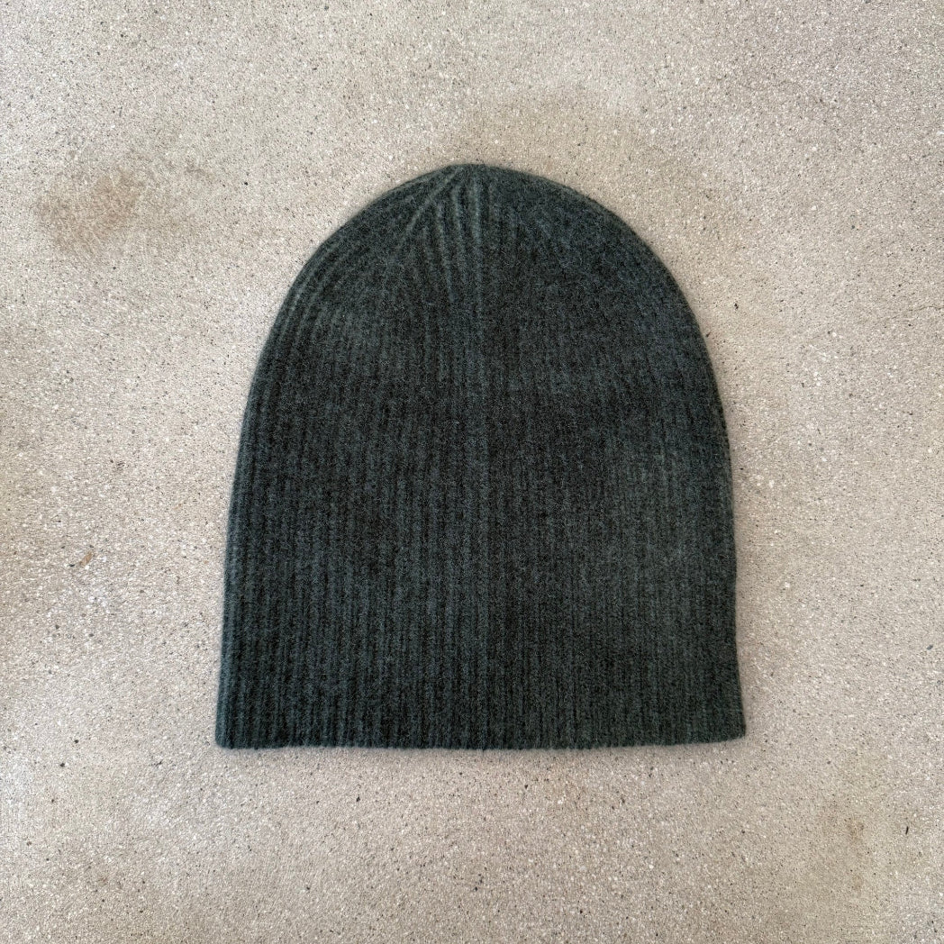 Ribbed knit beanie in 100% cashmere. Forest green with contrast interior.
